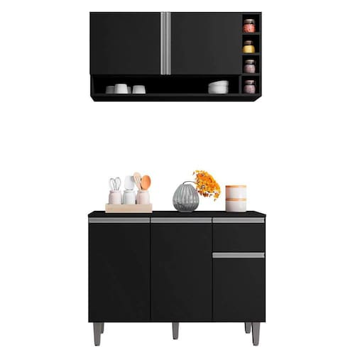 Pensando em praticidade e funcionalidade, o Balcão de cozinha possui um tampo para deixar seus utensílios e eletrodomésticos sempre a vista, conta também com 3 portas, 1 prateleira, pés em PVC e 1 gaveta com corrediças metálicas, perfeitos para guardar seus talheres, panelas e mantimentos. Já o Armário suspenso possui 2 portas, 1 prateleira e 1 nicho com 4 repartições para guardar temperos, potes, pratos e tudo o que precisar. Ambos os móveis, são produzidos 100% em MDP, acabamento em pintura UV, puxadores embutidos e dobradiças metálicas, garantindo resistência e durabilidade aos produtos.