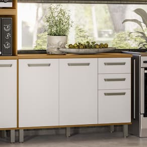 Dispõe de três portas com dobradiças metálicas reforçadas, que proporcionam um movimento suave e maior durabilidade no uso cotidiano do Balcão Com Tampo. As duas gavetas com corrediças telescópicas possuem abertura total, garantindo fácil acesso aos itens armazenados. Os puxadores em polímero conferem um toque sofisticado ao Balcão, combinando super bem com diversos estilos de decoração.