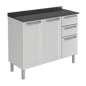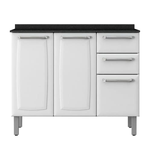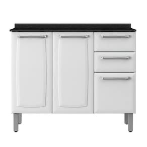 O balcão conta com 4 pés plásticos reguláveis, que permitem ajustar a altura conforme a necessidade. As corrediças telescópicas asseguram um deslizamento suave das gavetas, e as dobradiças metálicas reforçam a robustez das portas. O tampo em MDP revestido em fórmica adiciona um acabamento refinado, além de ser fácil de limpar e resistente a manchas.