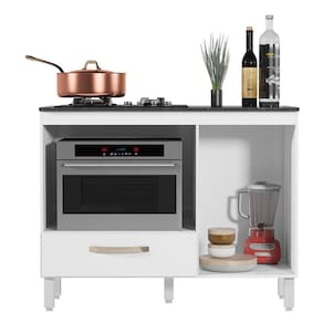 ESPECIFICAÇÕES: Estrutura em MDP Pintura UV 1 Porta Dobradiças metálicas 1 Gaveta Corrediças telescópicas Espaço para forno ou micro-ondas Puxadores em ABS Tampo em MDP para cooktop Tampo já cortado, ideal para fogão de 4 bocas Não acompanha fogão cooktop Pés em ABS