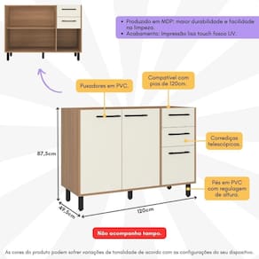 Transforme sua cozinha num ambiente elegante e funcional com o Balcão de Cozinha Gabinete Pia 120cm 3 Portas e 2 Gavetas Havana Multimóveis CR20310. Produzido em MDP de 15mm com impressão Touch UV fosca, garante durabilidade e resistência. Com um amplo espaço para organizar os utensílios de cozinha, ele possui 3 portas com puxadores em PVC, 2 gavetas com corrediças telescópicas, que oferecem um manuseio suave e silencioso, além de prateleira interna que suporta até 5kg. O balcão NÃO acompanha tampo (compatível com pia de 120cm). O design embutido das portas lembra um móvel planejado, tornando sua cozinha ainda mais sofisticada, enquanto os pés em PVC com regulagem de altura conferem maior estabilidade ao móvel e facilidade na higienização do ambiente.