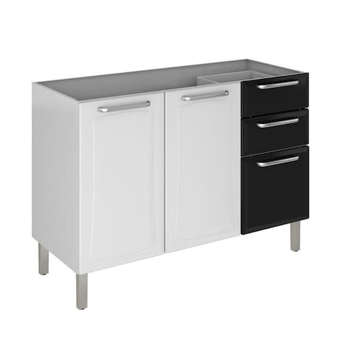 Destaques do Produto: Estrutura em aço resistente Espaço próprio para instalação de pia (balcão sem tampo) Dobradiças slow motion: portas que fecham suavemente Puxadores em ABS cromado com design moderno Gavetas com corrediças telescópicas: mais conforto e capacidade Pés com sapata regulável: mais estabilidade mesmo em pisos irregulares Cores sofisticadas: branco e preto, combinação que nunca sai de moda