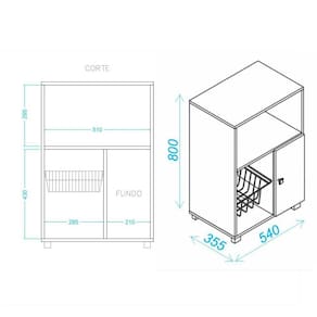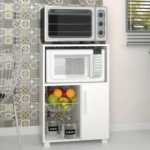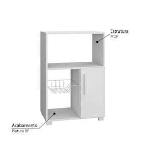 Fruteira produzida em MDP 15 mm com acabamento em BP Fosco. Conta com 1 porta, 1 cesto metálico e espaço para microondas ou forno. Conta com sapatas plásticas e o produto acompanha manual de montagem e kit ferragens.