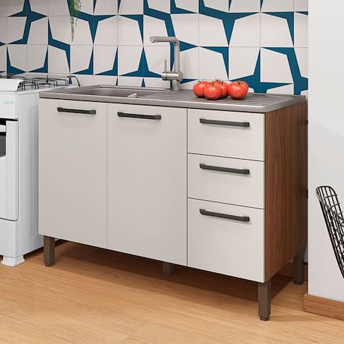 O(a) Balcão de Cozinha para Pia 120 Cm Mad Boreal 3 Portas 2 Gavetas Nogueira/Off White - Pnr Móveis é produzido em MDP na escala de brilho Semi-Fosco, e possui um grau de dificuldade de montagem: Médio.