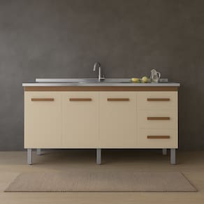 Possui 3 portas e 3 gavetas com corrediças metálicas. Conta com 1 prateleira interna. Acompanha 6 puxadores cromados. Possui 5 pés plásticos reguláveis, com altura mínima de 16,5 cm e ajuste até 18 cm.