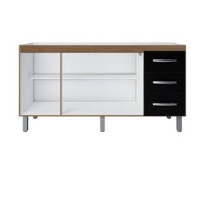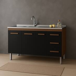 Possui 3 portas e 3 gavetas com corrediças metálicas. Conta com 1 prateleira interna. Acompanha 6 puxadores cromados. Possui 5 pés plásticos reguláveis, com altura mínima de 16,5 cm e ajuste até 18 cm.