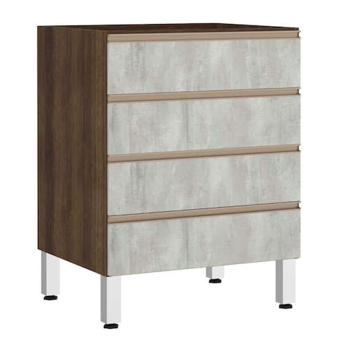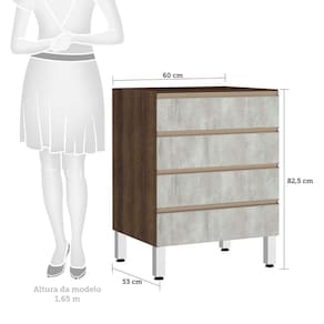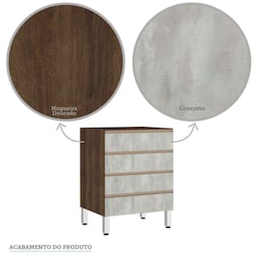 Características Corpo/Caixaria: MDP - Nogueira Dourado - FF. Frontais: MDP - Acabamentos em BP. Dobradiças: Ø35mm Slow motion. Puxadores: Alumínio Gola - Inox. Pés: P S - Cromado Corrediças Telescópicas: Abertura Total das Gavetas. Gavetas: 4 Montagem com Minifix, Parafusos e cavilhas.
