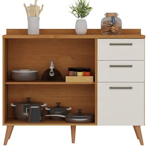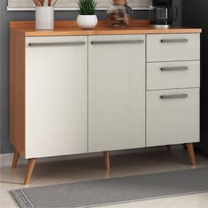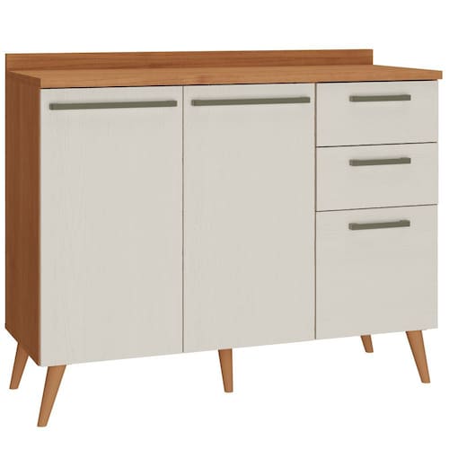 Estrutura: MDP com espessura de 15 mmAcabamento: Pintura U.V texturizado resistente de fino acabamentoPorta: Sim, 02 portas de abrir com dobradiças metálicas de 35 mmGaveta: Sim, 03 gavetas com corrediças telescópicas, sendo uma com gaveta com tamanho maior (gavetão), suporta o peso de ate 3 kg.Prateleira: Sim, prateleiras para melhor organizaçãoPuxadores: Sim, em PVCPés: Sim, 05 pés de em PVC, estilo palito retrô, maior durabilidade e segurançaDiferencial: Design elegante e sofisticadoDimensões do produto Montado