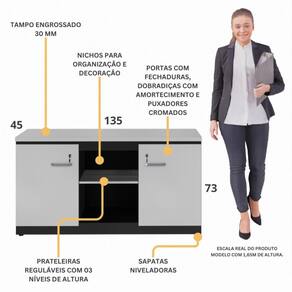 Diferenciais: - Acabamento em BP: textura sofisticada, fácil de limpar e resistente ao desgaste. - Produzido em MDP de reflorestamento: sustentabilidade com durabilidade garantida. - 2 portas com fechadura: mais segurança para documentos e objetos pessoais. - Dobradiças com amortecimento: fechamento suave, sem ruídos ou impactos. - Puxadores cromados: elegância e modernidade em cada detalhe. - Tampo engrossado de 30mm: robustez e estilo para o visual do escritório. - Nichos e prateleiras reguláveis: espaço inteligente para armazenar tudo com praticidade.