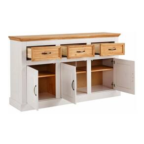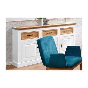 Balcão de madeira em branco lavado e cera com 3 portas e 3 gavetas. A Linha England valoriza a beleza da madeira, a combinação do branco lavado com cera enaltece a naturalidade e a beleza da madeira. Tanto a cor branco lavado quanto a cor cinza lavado é possível enxergar os belos veios da madeira e em combinação com as frentes das gavetas e tampos em cera, o estilo contemporâneo misturado ao natural se torna único.