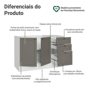 O acabamento de alta resistência da estrutura é em Branco e das portas em Cinza, possui uma textura suave ao toque. O destaque fica por conta dos puxadores ponto em ouro envelhecido, feitos com metal resistente, trazem personalidade e um charme único. Outro diferencial está no detalhe chanfrado das frentes, que forma molduras elegantes e dá profundidade, refletindo o estilo americano com um toque moderno.