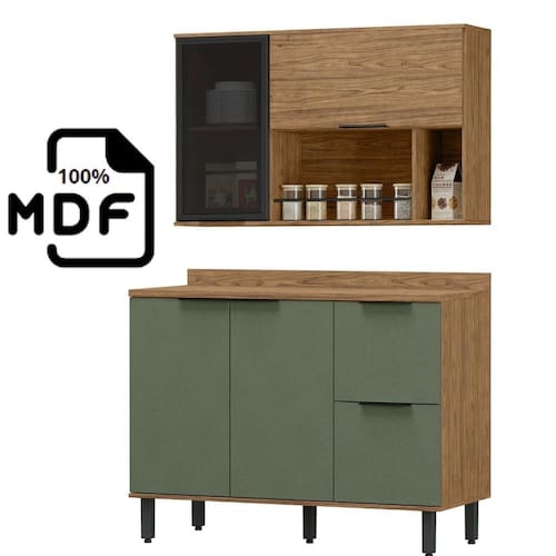 Oferece um amplo espaço interno, o balcão possui 2 portas e 3 Gavetas (sendo 1 Interna) para deixar a sua cozinha muito organizada e com muito estilo, já o aéreo possui 2 portas sendo uma basculante e outra com vidro fumê e com nichos para decoração.