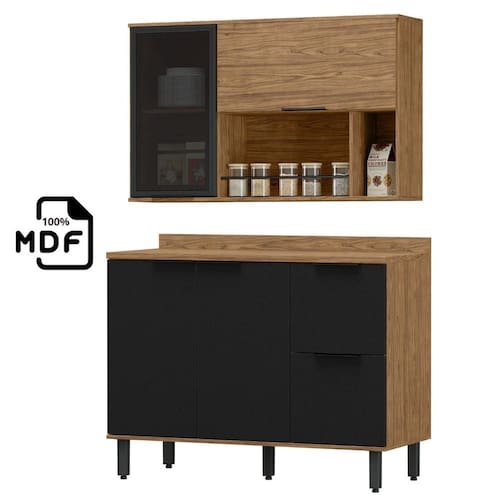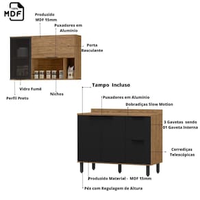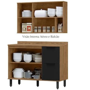 Oferece um amplo espaço interno, o balcão possui 2 portas e 3 Gavetas (sendo 1 Interna) para deixar a sua cozinha muito organizada e com muito estilo, já o aéreo possui 2 portas sendo uma basculante e outra com vidro fumê e com nichos para decoração.