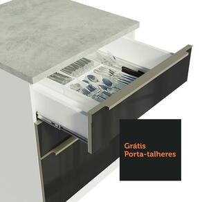 O acabamento da estrutura e da parte interna das gavetas é branco. As portas são pretas. É feito em Pintura Poliéster ecológica que protege o móvel contra os efeitos da água e do calor.