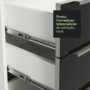 Além disso, possui três gavetas com corrediças telescópicas, sendo a última mais profunda. A ótima profundidade proporciona muito espaço para panelas, utensílios e louças.