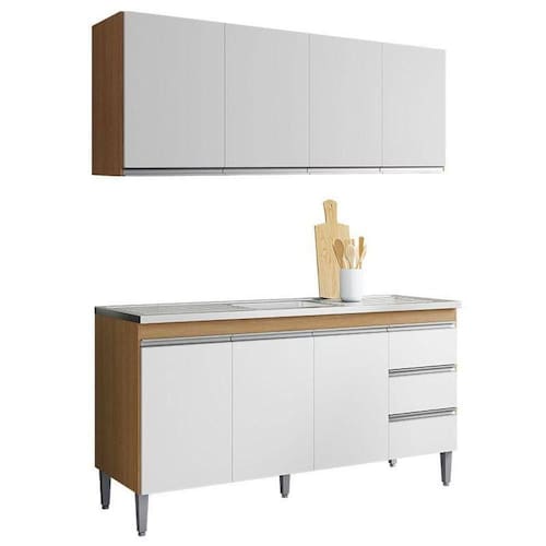 Está procurando móveis para sua cozinha? Apresentamos para você este belo conjunto composto pelo balcão e armário da linha Andréia. O balcão conta com três portas e três gavetas com corrediças metálicas, garantindo uma abertura suave e resistente. Os puxadores embutidos oferecem um visual moderno e discreto, enquanto seus pés em PVC proporcionam mais estabilidade e facilidade na hora da limpeza. Complementando o conjunto, o armário conta com quatro portas. Assim como no balcão, possui 150cm de largura, uma prateleira e puxadores em PVC. Fabricados pela AJL, são desenvolvidos em 100% MDP, sendo perfeito para quem busca otimizar o espaço da cozinha com estilo e praticidade, mantendo a qualidade e o acabamento. Aproveite e garanta já o seu!