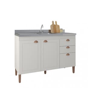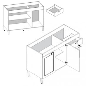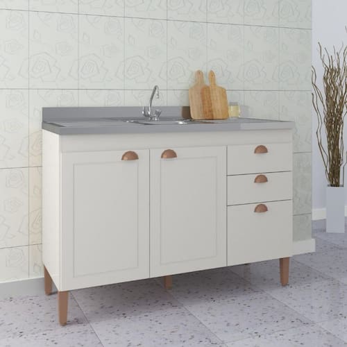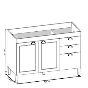 Características: 2 Gavetas 1 Prateleira 3 Portas 5 Pés reguláveis Corrediças 30mm telescópicas Dobradiças de metal Estrutura em MDP Puxadores em concha Sistema de montagem parafusos, cavilhas e minifix