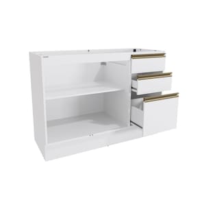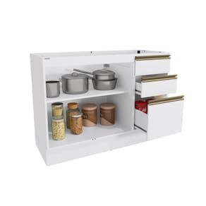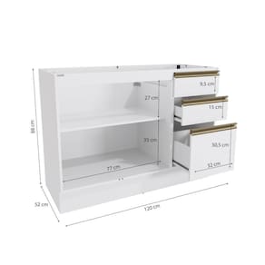 Acabamento: Pintura Brilho | Acabamento da Fita Borda: Papel | Cor: Branco | Corrediças: Telescópicas | Dobradiça: Com Amortecimento | Garantia: 3 meses para defeito de fabricação | Matéria-prima: MDF | Peso suportado por cada gaveta: 6 Kg | Peso suportado por cada prateleira: 7 kg | Puxadores: Puxadores de Metal e de Alumínio | Quantidade de gavetas: 3 | Quantidade de prateleiras: 1 | Sistema de montagem: Parafuso Philips