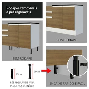 Os pés são reguláveis em PVC e o rodapé é removível para facilitar a limpeza. Conta ainda com o tampo, que pode ser removido para a colocação de pia com 120 cm de largura por 52 cm de profundidade.