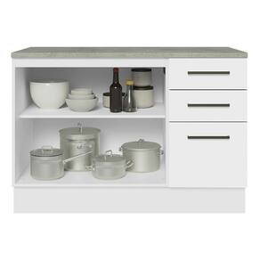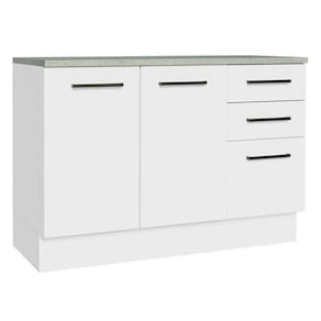 Os pés são reguláveis em PVC e o rodapé é removível para facilitar a limpeza. Conta ainda com o tampo, que pode ser removido para a colocação de pia com 120 cm de largura por 52 cm de profundidade.
