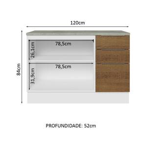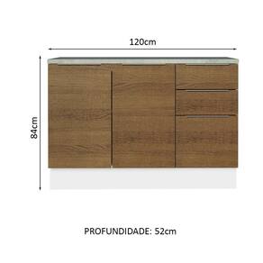 Os pés são reguláveis em PVC e o rodapé é removível para facilitar a limpeza. Conta ainda com o tampo, que pode ser removido para a colocação de pia com 120 cm de largura por 52 cm de profundidade.