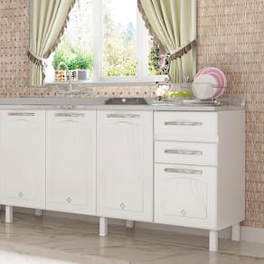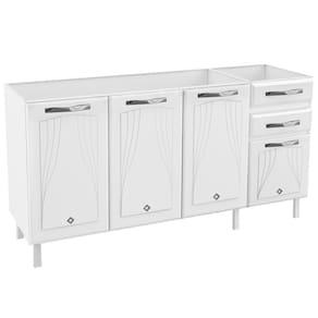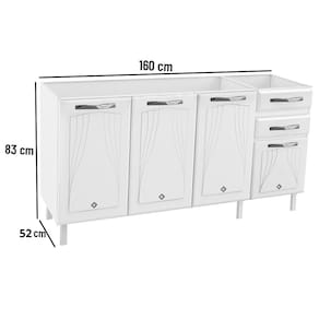 O Balcao de Pia em Aco 4 Portas 2 Gavetas 160cm sem Pia Star New Telasul e ideal para organizar sua cozinha com funcionalidade e estilo. Possui 4 portas com apliques resinados e 2 gavetas com corredicas metalicas que suportam ate 3kg cada. Sua estrutura em aco com revestimento BF e pintura eletrostatica anticorrosiva garante resistencia e durabilidade. Conta com prateleira interna que suporta ate 15kg, base reforcada para ate 30kg, pes regulaveis e puxadores em plastico. Nao acompanha tampo.