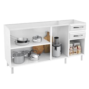 Caracteristicas: 2 Gavetas suportam ate 3kg com corredicas metalicas 4 Portas com apliques resinados 1 Prateleira interna suporta 15kg Acabamento em pintura eletrostatica e anticorrosiva Base suporta ate 30kg Estrutura em aco e polipropileno Nao acompanha tampo Possui pes regulaveis e puxadores de plastico Revestimento BF