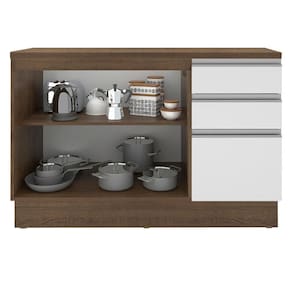 - Um (1) Balcão de 120 cm de largura com duas (2) portas e três (3) gavetas com tampo em MDP em pintura Rustic