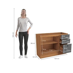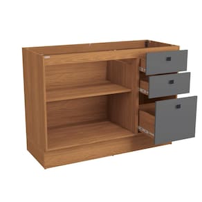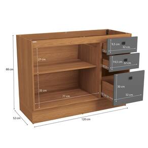 Fechando ótimas combinações com o aéreo do mesmo tamanho, o balcão pode ser montado com cuba, tampo ou pedra, e para um melhor acabamento, ele conta com rodapé, mas acompanha as ferragens para ser montado suspenso, e se você preferir, também pode adquirir os pés separadamente, garantindo muita praticidade. Indispensável em todas as composições, medindo 88cm de altura, 120cm de largura e 52cm de profundidade, são duas portas, prateleiras e três gavetas, ele oferece amplo espaço para organizar louças e mantimentos com praticidade. Aqui, o destaque fica para as gavetas, duas menores e um gavetão, com corrediças telescópicas, garantindo organização para seus talheres e as dobradiças com amortecimento nas portas, garantem um fechamento suave e sem ruídos, incluindo mais durabilidade.