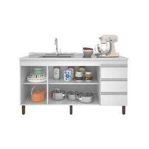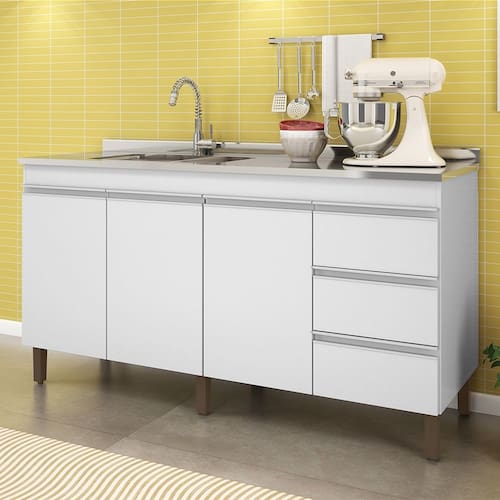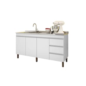 Características: Estrutura em MDP Pintura UV 03 Portas com dobradiças metálicas 03 Gavetas com corrediças metálicas Puxadores em PVC Pode ser montado dos dois lados Amplo espaço interno Pés plásticos com regulagem de altura NÃO ACOMPANHA TAMPO NEM CUBA.