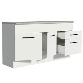 Já as duas gavetas contam com corrediças telescópicas, que permitem sua total abertura. Por seu ótimo tamanho, o balcão permite acomodar de maneira organizada: panelas, utensílios, louças, talheres e muito mais.