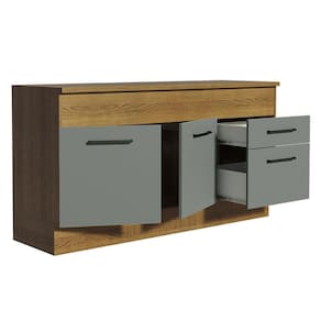 O acabamento da estrutura é em amadeirado Rustic e o das portas e frentes das gavetas é cinza. É feito em Pintura Poliéster com sete camadas, um método ecológico e que protege o móvel dos efeitos da água e do calor.