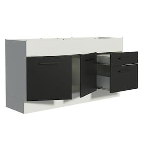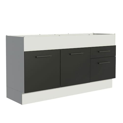 O acabamento da estrutura é branco e o das portas e frentes das gavetas é preto. É feito em Pintura Poliéster com sete camadas, um método ecológico e que protege o móvel dos efeitos da água e do calor.