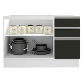 Possui duas portas e três gavetas com corrediças telescópicas. É perfeito para colocar panelas, utensílios, louça, talheres, pano de prato. Tudo de forma organizada com o melhor aproveitamento de espaço.