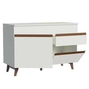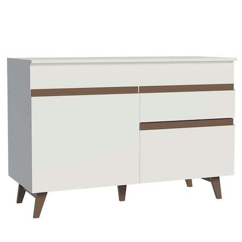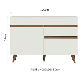 Um grande destaque são os pés em madeira maciça com acabamento em amadeirado Rustic, que conferem beleza e mais firmeza ao móvel. Além disso, acompanha tampo em MDP, que pode ser removido para a colocação de pia de 120 cm de largura por 52 cm de profundidade.