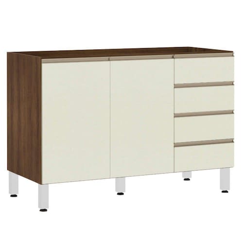 Características Corpo/Caixaria: MDP - Nogueira Dourado - FF. Frontais: MDP - Acabamentos em BP. Dobradiças: Ø35mm Slow motion. Puxadores: Alumínio Gola - Inox. Pés: P S - Cromado Corrediças Telescópicas: Abertura Total das Gavetas. Gavetas: 4 Porta: 2 Prateleira: 1 Não acompanha tampo de Pia Montagem com Minifix, Parafusos e cavilhas.
