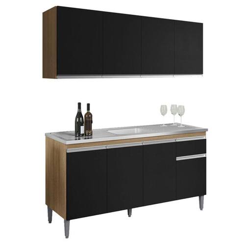 Balcão de Pia Tatiane 145 cm e Armário Aéreo Andreia 150 cm 4 Portas Amêndoa Preto – AJL
