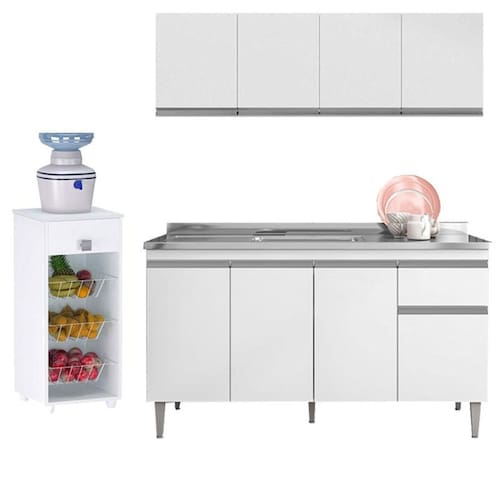 Balcão de Pia Tatiane 145 cm e Armário Aéreo Andréia 4 Portas 150 cm com Fruteira Monalise Branco Brilho – AJL