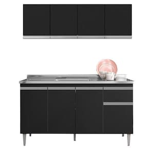 Balcão De Pia Tatiane 145 Cm E Armário Aéreo Andréia 4 Portas 150 Cm Preto Fosco - Ajl