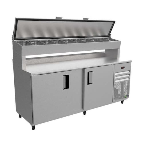 - Equipamentos destinados à refrigeração de bebidas, laticínios, frios e alimentos diversos, não congelados; - Revestimento externo padrão inox 430; - Revestimento interno em aço galvanizado; - Gás R290, fluido natural, sem impactos negativos na camada de ozônio e alta eficiência energética; - Possui 1 nível de prateleira aramada, com regulagem de altura; - Tampo liso com espelho; - Cantos sanitários para facilitar a limpeza interna; - Controlador digital de temperatura, de 2 C a 7 C; - Degelo automático; - Utilização de cubas padrões 1/2, 1/3 e 1/4; - Pés plásticos com regulagem de altura; - Aquecimento nas colunas.