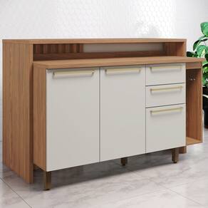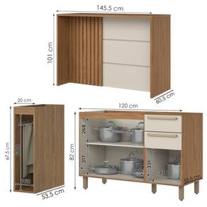 Linha Requinte combina modernidade e versatilidade, criando um ambiente charmoso e acolhedor com seus tons amadeirados. Um conjunto completo com 5 peças, composto por 2 balcões e uma bancada, balcão Pia 120 cm (com tampo de 120 cm), balcão porta toalha 20 cm (com tampo de 82 cm) e uma Mesa Bancada Gourmet 146 cm. O conjunto conta com estrutura 100% MDP de 15mm (fundo em MDF de 3mm), 3 Portas com dobradiças metálicas 25mm e amortecimento, 2 gavetas com corrediças telescópicas, puxadores em alumínio (dourado) e pés em plásticos ABS com altura regulável, além de contar com 1 prateleira interna suportando até 8kg. Conjunto com acabamento em pintura UV texturizada, que oferece sofisticação e facilidade na limpeza, com detalhes em aplique ripados. Este conjunto chegará em sua casa separado em 5 volumes.