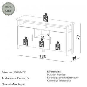 Dimensões: Altura: 73 cm Largura: 135 cm Profundidade: 38 cm