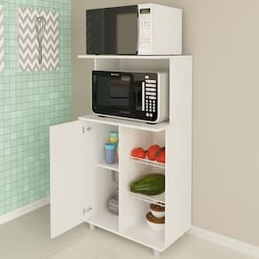 Características do Produto Material da Estrutura: MDP 15 mm. Peso Suportado: Prateleiras e Cesto: 3 Kg / Tampo: 13 kg. Cor: Branco. Acabamento: BP. Escala de Brilho: Fosco. Quantidade de Portas: 1 Porta. Material da Porta: MDP. Tipo de Corrediças: Plásticas. Tipo de Puxador: PVC cromado. Tipo de Pé: PVC. Diferenciais: - Design moderno. - Estrutura resistente. - Espaço para micro-ondas. - Cestos aramados. Sistema de Montagem: Minifix / Cavilhas / Parafusos. Manual de Montagem: Sim. Complexidade da Montagem: Média. Volumes: 1 Volume. Garantia do Fabricante: 90 dias contra de fabricação. Montagem: Recomendamos que seja feita por um . Recomendação de Limpeza: Utilize pano levemente úmido.