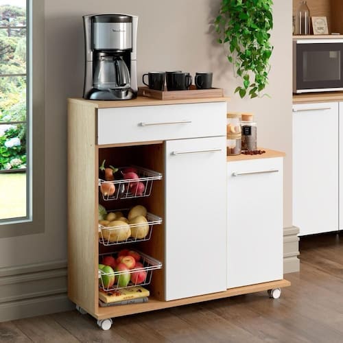 Cestos/Fruteiras em aramado. Puxadores cromados produzidos em polímeros, posui também rodizíos.