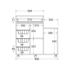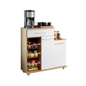 O tampos suportam até 15kg cada. O balcão possui duas portas e uma prateleira interna que suporta até 15 kg, possui uma gaveta com corrediça e três cestos/fruteiras metálicos em aramado. Produto produzido em MDP 15mm e revestido em pintura UV atóxica.
