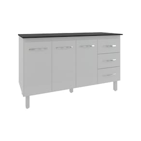 Características do Balcão: Altura com pés: 83,5 cm Altura sem pés: 67 cm Largura: 138 cm Profundidade: 50 cm Material: MDP (Madeira de Média Densidade) Portas: 2 portas Gavetas: 3 gavetas Prateleiras: 1 prateleira Puxadores: 5 puxadores plásticos cromados Pés: 5 pés reguláveis de plástico Altura dos pés: 16,5 cm Regulagem dos pés: Ajuste máximo até 18 cm, apenas para nivelamento Corrediças: Metálicas Indicação de uso: Cozinha