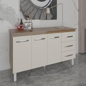 Balcão Gabinete Armário Cozinha Carine Savana Off White Com Tampo Tampão 140 Cm Mobília Decor Savana Se você busca um móvel elegante, espaçoso e que combine com o seu ambiente, o Kit Balcão Carine com Tampo é a escolha perfeita! Produzido em MDP, ele oferece durabilidade e beleza, com puxadores plásticos cromados que adicionam um toque especial. Seus pés de plástico são extremamente resistentes, garantindo estabilidade e ajuste de altura conforme a sua necessidade. Não perca tempo, adquira já o seu! Características do Balcão: Altura com pés: 83,5 cm Altura sem pés: 67 cm Largura: 138 cm Profundidade: 50 cm Material: MDP (Madeira de Média Densidade) Portas: 2 portas Gavetas: 3 gavetas Prateleiras: 1 prateleira Puxadores: 5 puxadores plásticos cromados Pés: 5 pés reguláveis de plástico Altura dos pés: 16,5 cm Regulagem dos pés: Ajuste máximo até 18 cm, apenas para nivelamento Corrediças: Metálicas Indicação de uso: Cozinha