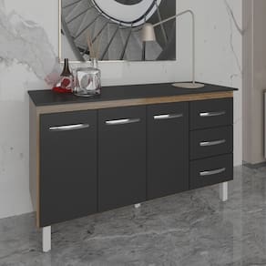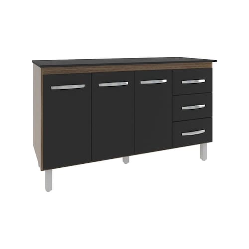 Características do Balcão: Altura com pés: 83,5 cm Altura sem pés: 67 cm Largura: 138 cm Profundidade: 50 cm Material: MDP (Madeira de Média Densidade) Portas: 2 portas Gavetas: 3 gavetas Prateleiras: 1 prateleira Puxadores: 5 puxadores plásticos cromados Pés: 5 pés reguláveis de plástico Altura dos pés: 16,5 cm Regulagem dos pés: Ajuste máximo até 18 cm, apenas para nivelamento Corrediças: Metálicas Indicação de uso: Cozinha