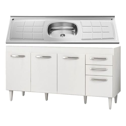 Com cozinhas cada vez menores, é preciso estar atento na hora de escolher o móvel que vai compor o ambiente, afinal, deve ser compacto e funcional, assim como o Balcão Gabinete Áustria com Pia Inox, da Lumil Móveis. Com 160cm esse balcão conta com 4 portas e 2 gavetas que são excelentes para organizar seus utensílios.