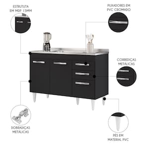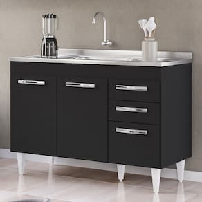 Balcão Gabinete com Pia Inox 120cm 3 Portas 2 Gavetas Suécia Preto - Lumil